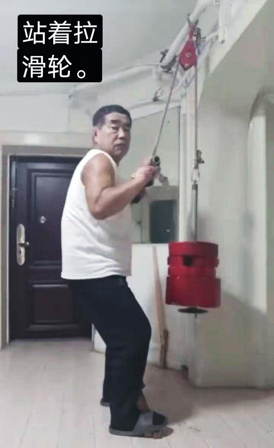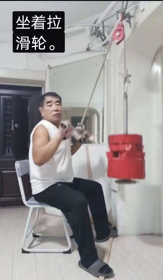 和坐着蹬滑轮炼腿力。用滑轮健身能炼四个项目。